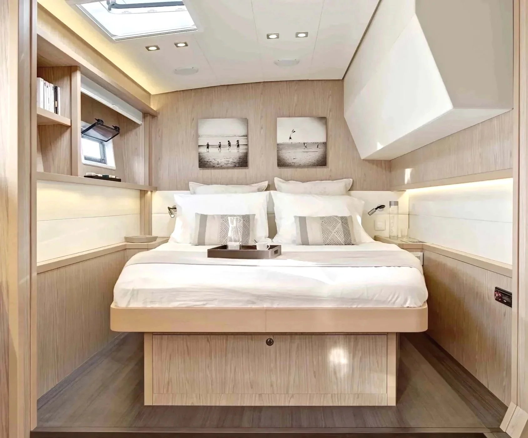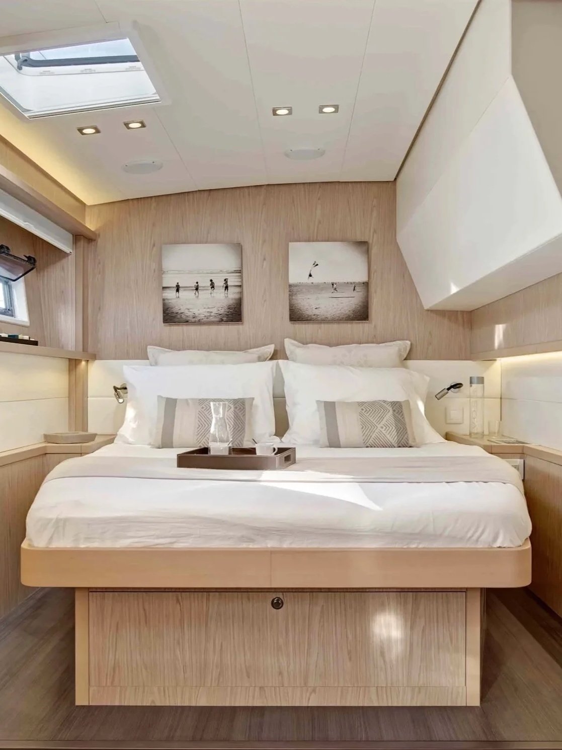 The peak experience located in the front of our yacht. These are our largest, most impressive cabins, featuring expansive windows for panoramic views, ensuite bathroom, and a full Queen "island" bed.